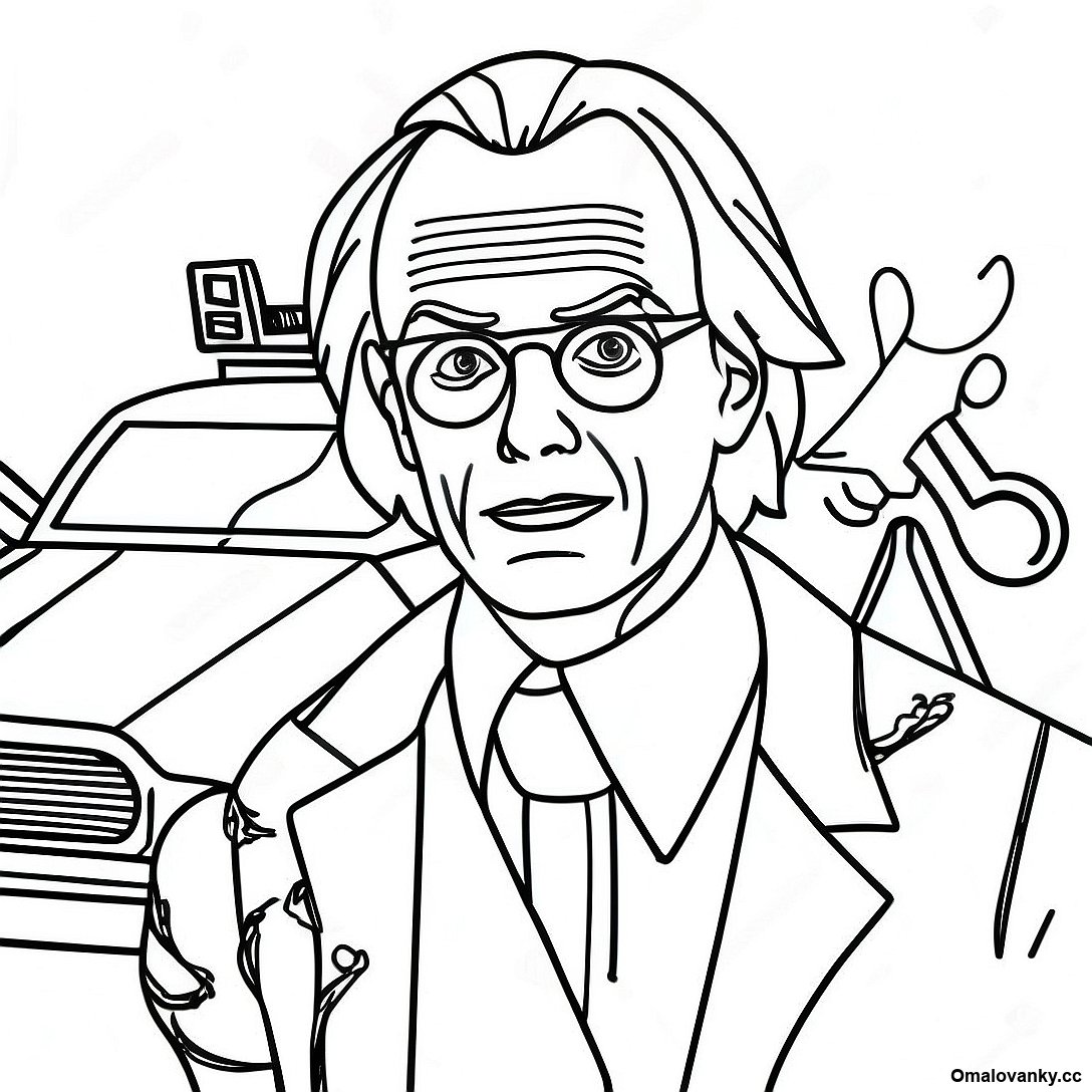 Stáhněte si tisknutelné PDF omalovánky Doc Brown S Časovým Strojem Omalovánka