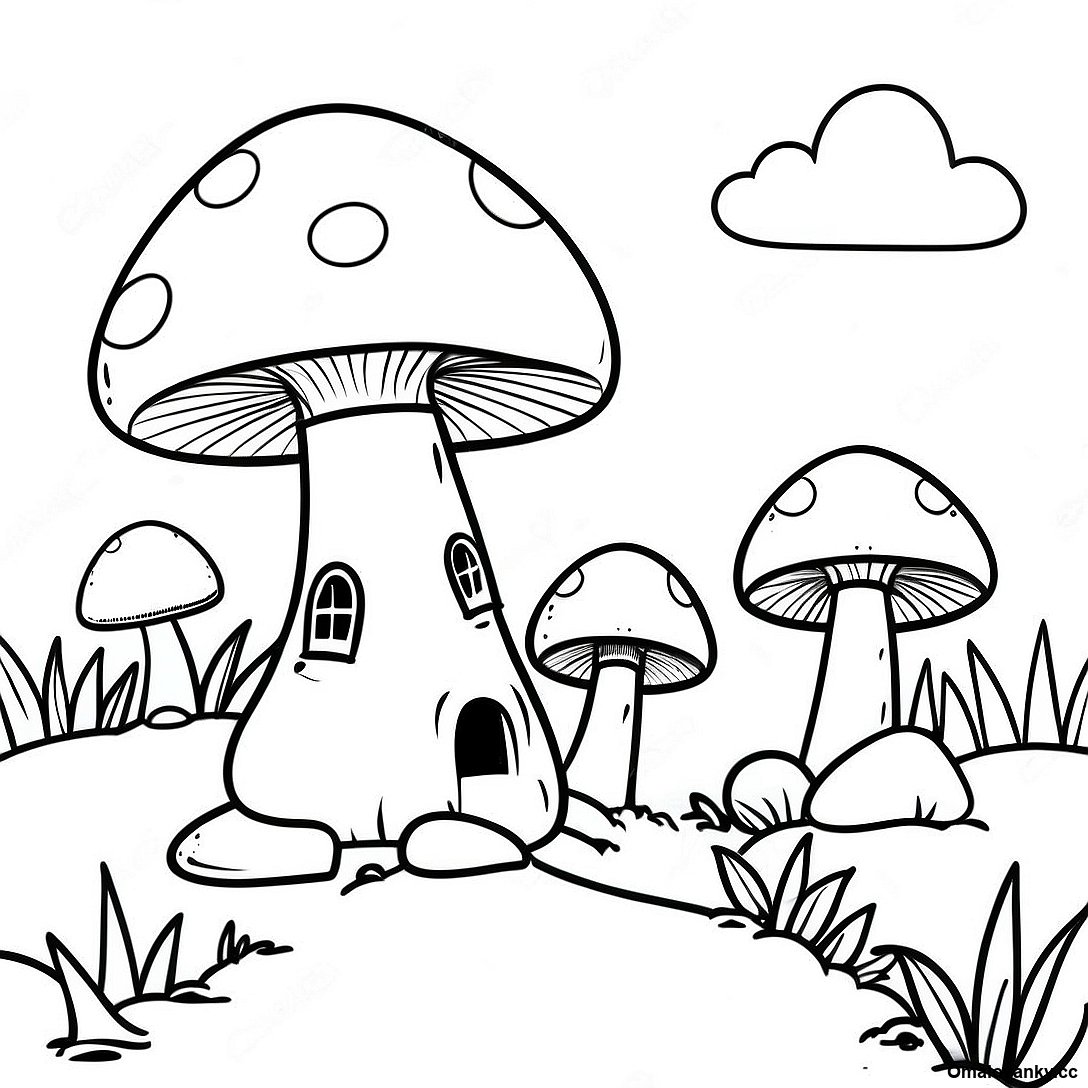 Stáhněte si tisknutelné PDF omalovánky Fantastická Houbová Vesnice Omalovánka