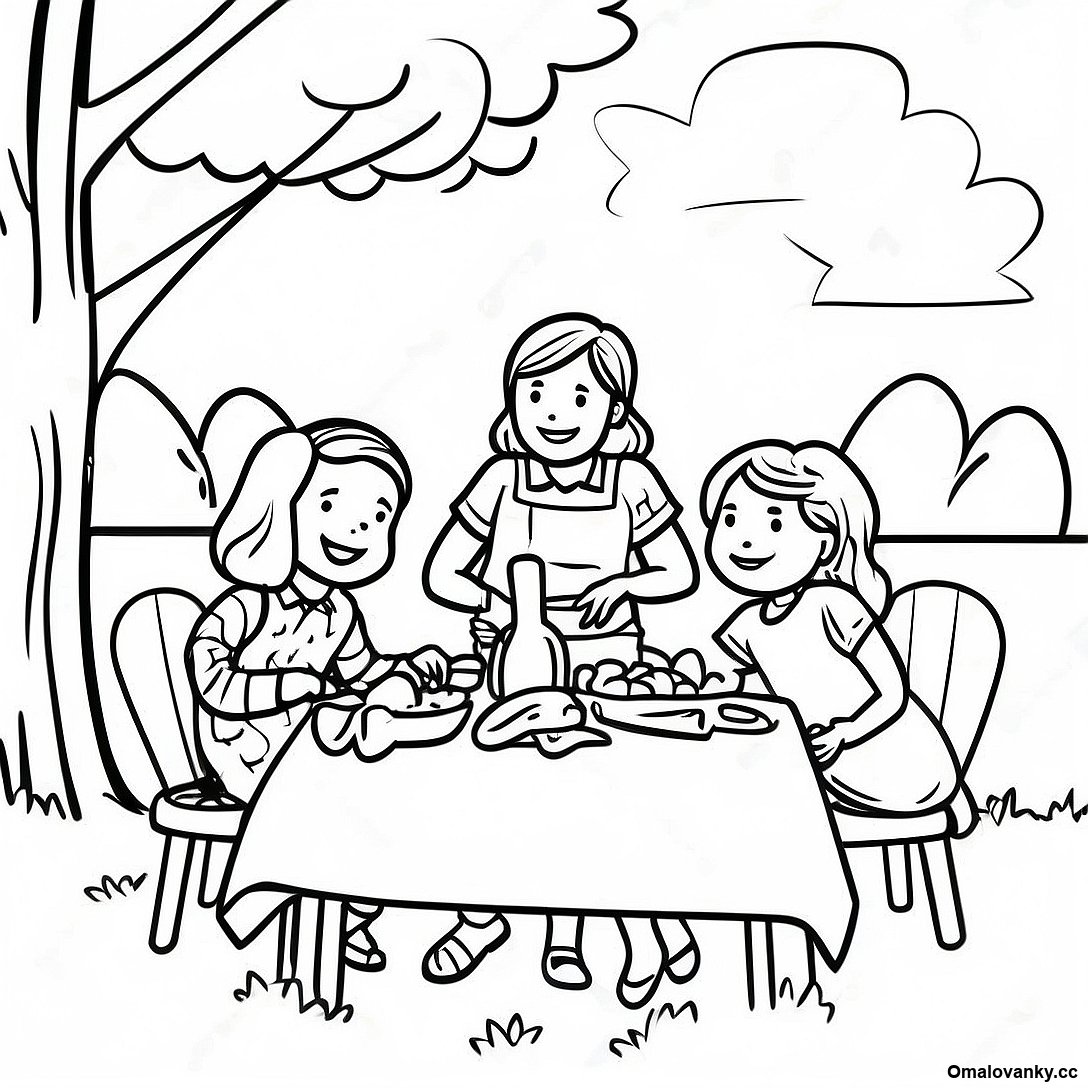 Stáhněte si tisknutelné PDF omalovánky Radostný Rodinný Piknik Omalovánka