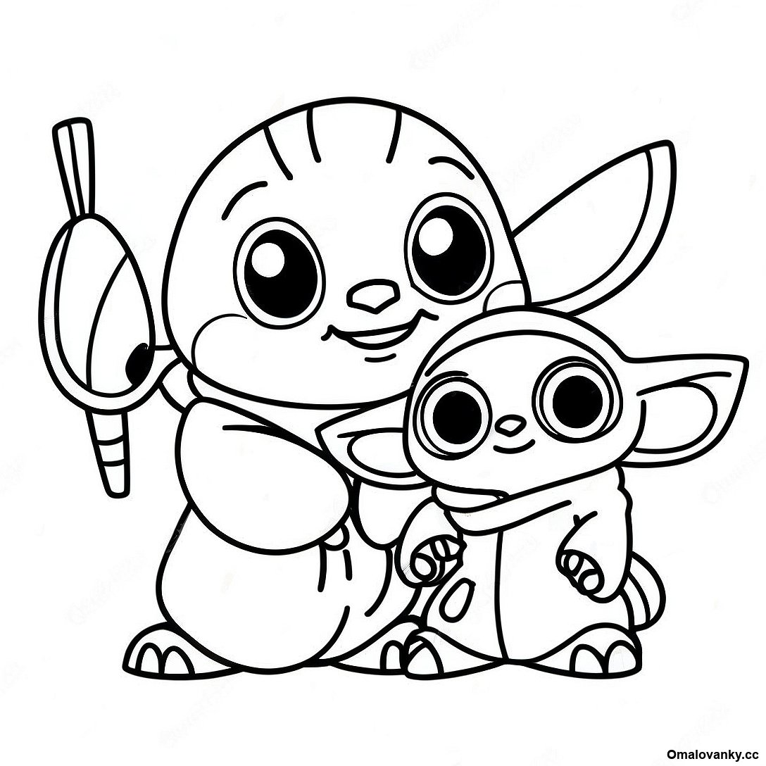 Stáhněte si tisknutelné PDF omalovánky Šťastné Omalovánky Stitch A Baby Yoda