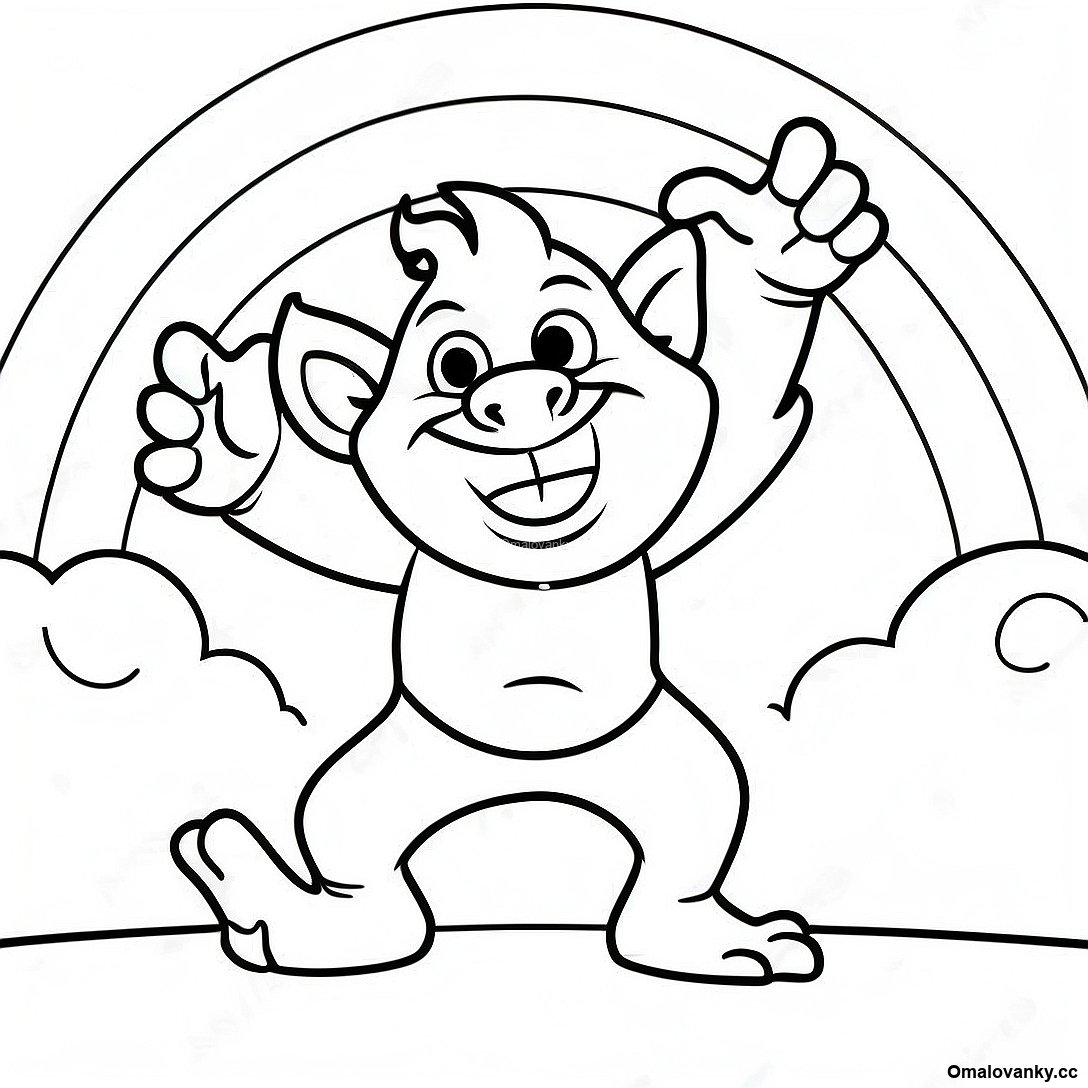 Stáhněte si tisknutelné PDF omalovánky Šťastný Troll Tančící Pod Duhou Omalovánka